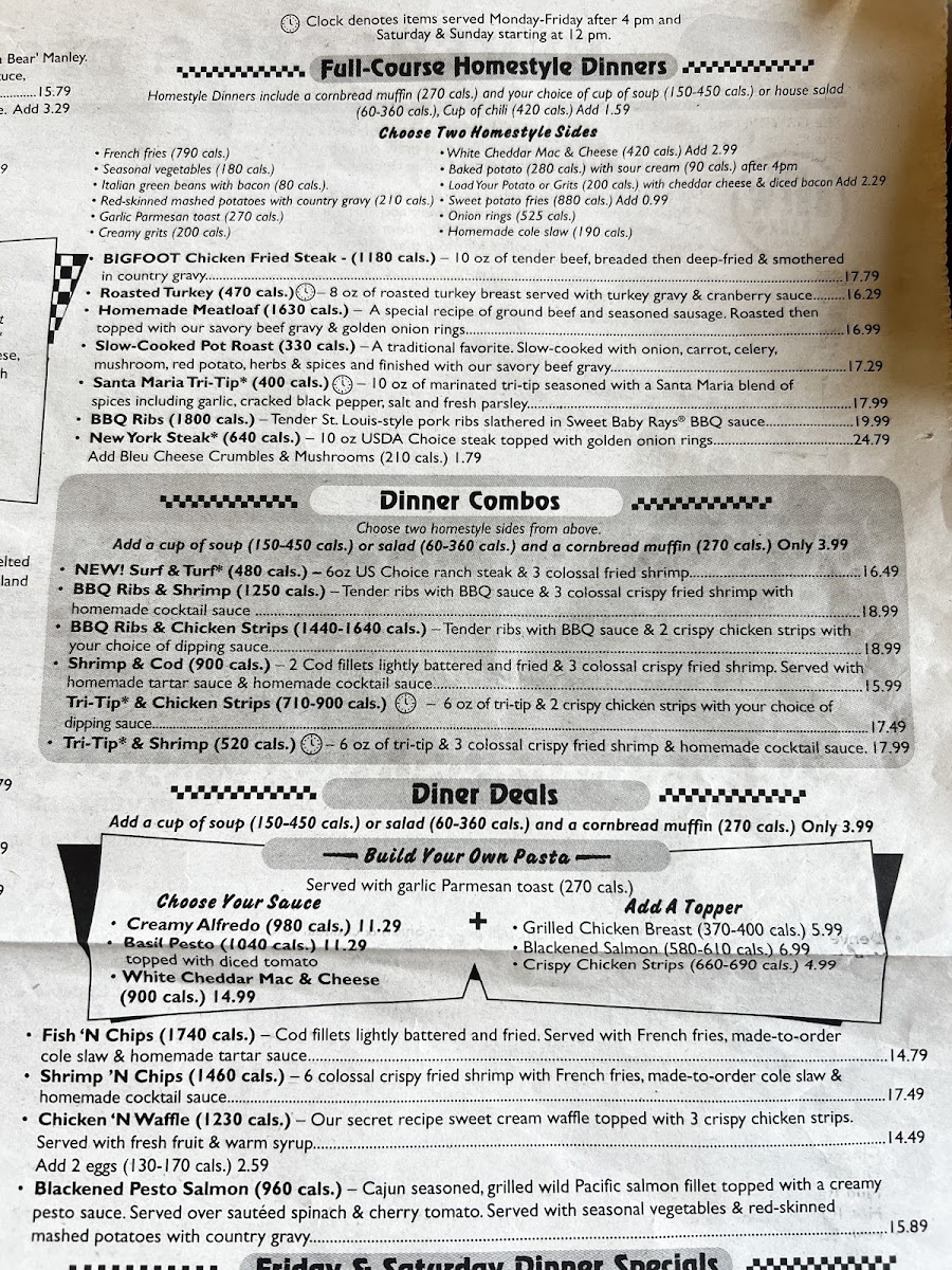 The menu offers a delightful array, from hearty breakfast staples to satisfying family meals. Noteworthy highlights include the Taco Salad with seasoned beef or grilled chicken, and a comforting Bowl of Chili brimming with flavor. Families will appreciate the generous portion sizes like the Bacon, Eggs & Pancakes Family Meal, perfect for sharing.