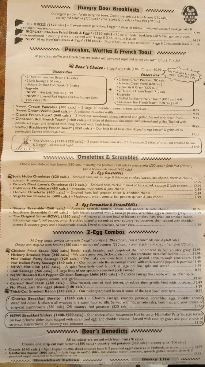 4 Bear Paw Chicken Fried Steaks with country gravy, served with 8 Scrambled eggs, 4 housemade biscuits and your choice of strip-cut hash browns or country red potatoes.